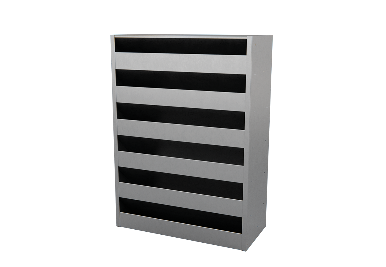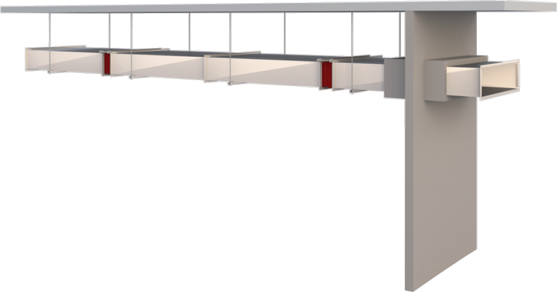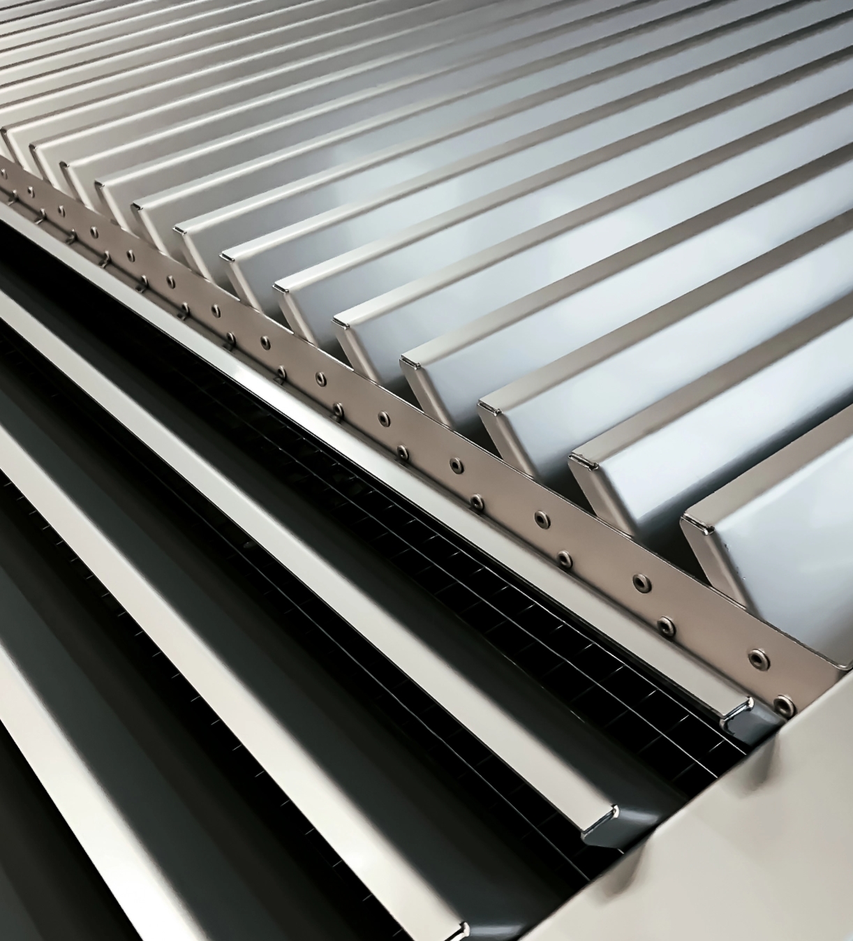 DL-Lamellenhauben in eckiger Ausführung dienen der Fort- und Zuluftführung bei gleichzeitigem Schutz der Leitungsstränge. Grundlage ist eine stabile Unterkonstruktion, an der die Lamellen verdeckt befestigt sind.